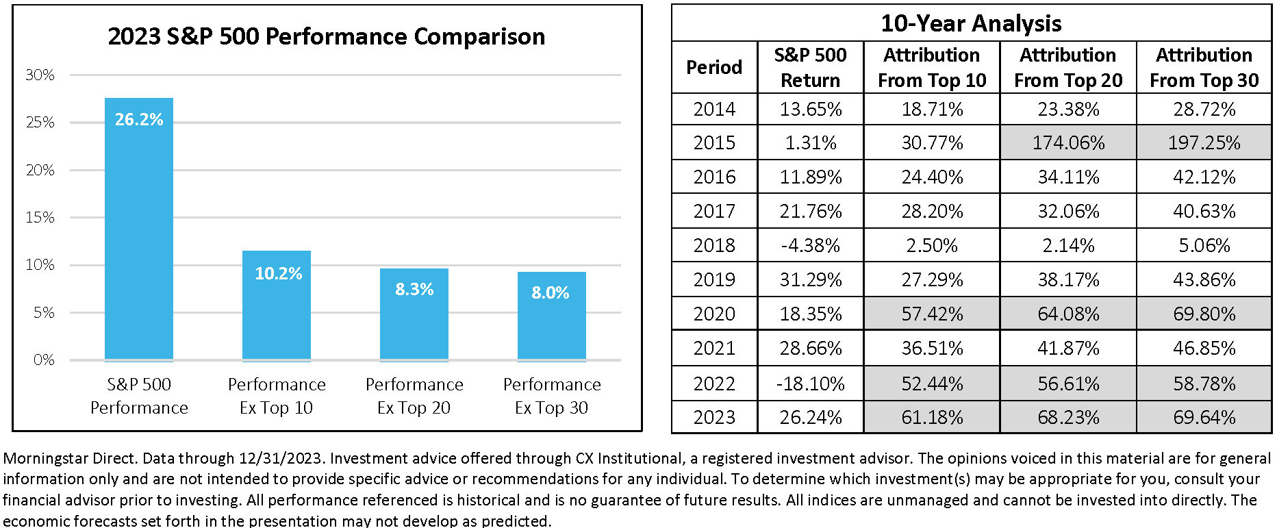 The pursuit of excess investment returns in 2023 was predominantly determined by having substantial investments in the top 10 companies of the S&P 500 Index, as measured by market capitalization. Forgoing an oversized commitment to those 10 companies would entail a significant – and appropriate – underperformance compared to the S&P 500’s overall return. Upon closer examination of the S&P 500’s performance, it becomes apparent that a substantial 61% of 2023’s gains can be attributed to these specific companies. To illustrate this differently, if we were to exclude the top 10 names from the S&P 500’s return of 26.2% in 2023, the performance would drop to 10.2%. While the return dominance by the top 10 companies within the S&P 500 is not a new phenomenon to 2023, the current overconcentration in performance appears to be pushing the boundaries in an unprecedented manner. The S&P 500, with its continually ascending valuation profile, stands as a testament to this trend. However, it is crucial to recognize that this concentration does not guarantee an unbroken streak of outperformance for the upcoming year. Chasing performance from the top names may lead to an unnecessary and potentially destructive risk profile.