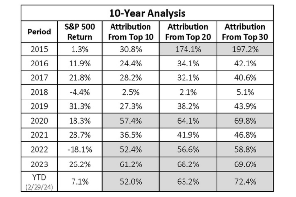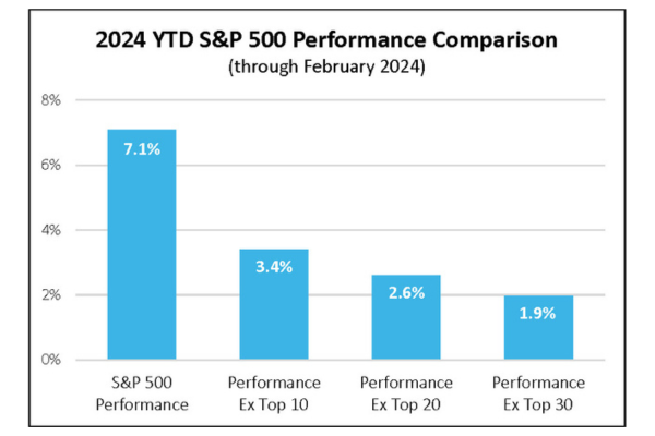 For further clarity, it is important to understand the composition of the S&P 500. The index, a widely tracked benchmark, exhibits a significant concentration, with an outsized 48.7% of its composition represented by the largest 30 companies based on market capitalization. This substantial concentration underscores the inherent risk of blindly chasing performance, as a well-diversified portfolio should not closely track an index so heavily skewed towards a handful of mega caps. Considering this, a prudent investment approach necessitates a careful evaluation of the risks associated with pursuing concentrated performance, along with a thoughtful consideration of diversification across geographies, style class, and market capitalization to implement a risk-centric approach to investment management.