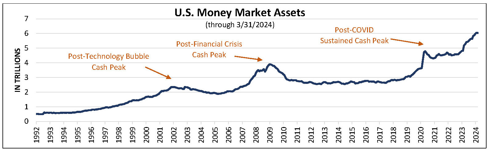 Volatility across capital markets is often a sign of cash exiting or entering a specific asset class, which can be defined as exposure to stocks, bonds, commodities, or any other investment that carries a reasonable liquidity profile. Measuring the level of cash that investors are sitting on has often provided an actionable perspective as to the potential medium-term outlook for capital markets. It has also provided an understanding of why cash levels may have risen (or declined) relative to macroeconomic and geopolitical events. The cash analysis conversation becomes paramount in today’s environment because U.S. investors are currently sitting at record-high cash levels (as measured by money market funds). We believe this to be an immense benefit for those investors willing to sustain or increase their level of equity market participation.